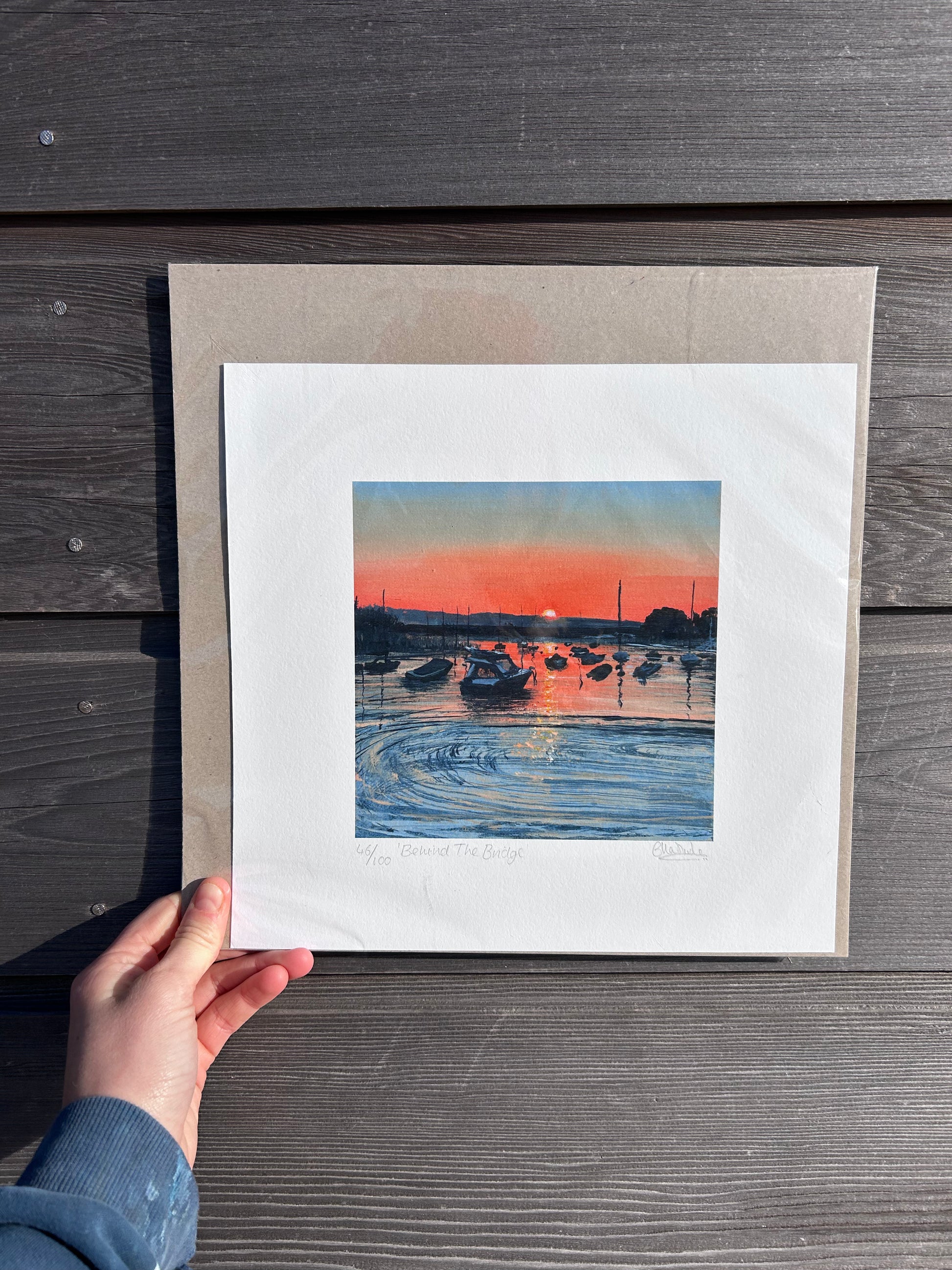 Limited edition of 100 reproduction of the original Ella Slade painting Behind the Bridge 2023. Acrylic and acrylic ink.